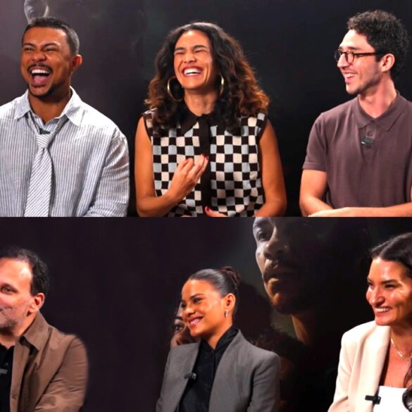 Bella Campos, Xamã, Bárbara Colen, João Vitor Silva, o diretor Bruno Bini e a produtora executiva Luciana Druzina discutem o filme de ação, que venceu o Festival de Gramado.