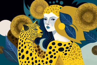 Uma reunião festiva e afetuosa entre amigas trans, comparadas à imagem de uma onça. Mostra Quelly 2023.