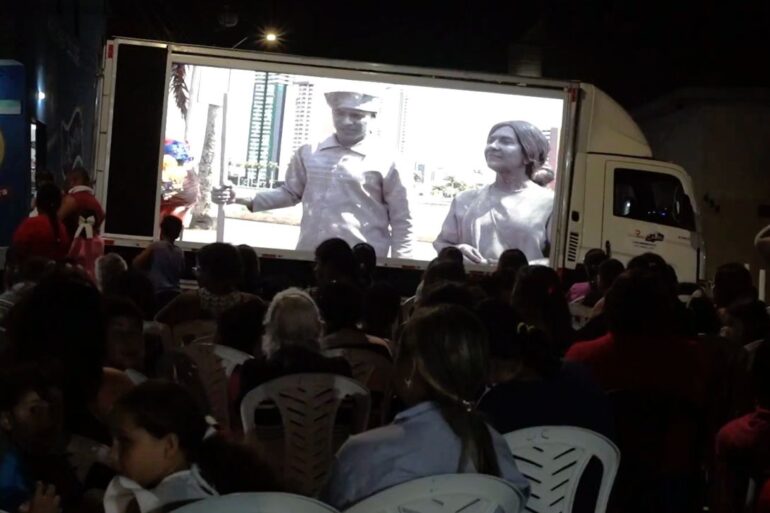 A sessão ao ar livre ocorreu na Catingueira, Campina Grande, levando a arte a dezenas de moradores. Comunicurtas 2025.