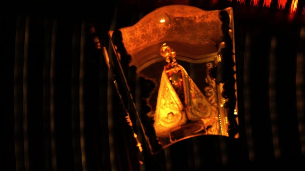 Os personagens atravessam uma espécie de descida aos infernos, como se diria na crítica francesa, misturando tempo e espaço, controle e descontrole — vide a bela cena da Virgem conduzindo Fernando por um longo corredor, porém, num corte da montagem, encontrando-se imediatamente atrás dele. Este deslocamento ocorre sob vitrais coloridos no teto, como se o protagonista nunca saísse, de fato, da Igreja, navegando em suas pulsões enquanto permanece no interior da estrutura religiosa. (A libido esteve sempre dentro dele, sem precisar buscá-la ao redor. Em outras palavras, não foi o mundo que o tentou; esta seria parte de sua natureza reprimida). As luzes coloridas no corredor, assumidamente artificiais, remetem a Suspiria, terror de Dario Argento no qual a luminosidade e os cenários funcionavam como opressão e deslumbramento aos olhos, em simultâneo.