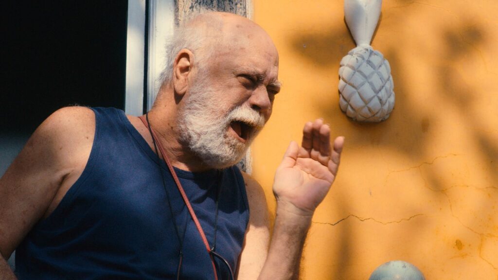 A situação não melhora com a construção dos personagens masculinos. O avô (Tonico Pereira) é um sujeito grosseiro, desbocado, homofóbico — algo que o filme considera hilário. Não se critica o fato de apresentar pessoas com tais características em si, afinal, os preconceitos podem ser expostos para finalidade de crítica social. Entretanto, O Velho Fusca se diverte demais com o senhor agressivo para criticá-lo de fato. Por isso, exagera no tom de piadas como “Segura meu pau”, quando o homem menciona sua bengala, e “Tenha culhão de pedir que nem homem”. O filme permite que o personagem dê um banho de homofobia recreativa, e não apenas ele. Os diálogos estão repletos de piadas a respeito de “ser namoradinha na cadeia”, culminando no desfecho de ambições existenciais, aconselhando o espectador a “viver de verdade… sem frescura”. Nada muito inclusivo, embora o discurso acredite sê-lo.